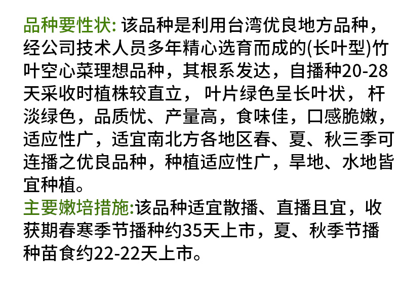 - 颜色分类: 三叉空心菜种子50克装+一包有机肥 空心菜套餐@种子/盆/土/肥/铲 三叉空心菜种子400克原装 三叉空心菜种子50克装 竹叶空心菜种子500克原装 竹叶空心菜种子60克装 泰国柳叶1斤装(500g超实惠) 泰国柳叶空心菜60克装 柳叶白杆空心菜种子10克原装 大叶白杆空心菜种子10克原装 泰国柳叶空心菜种子10克原装 青梗柳叶空心菜苗6棵 青梗柳叶空心菜苗12棵 青梗柳叶空心菜苗24棵